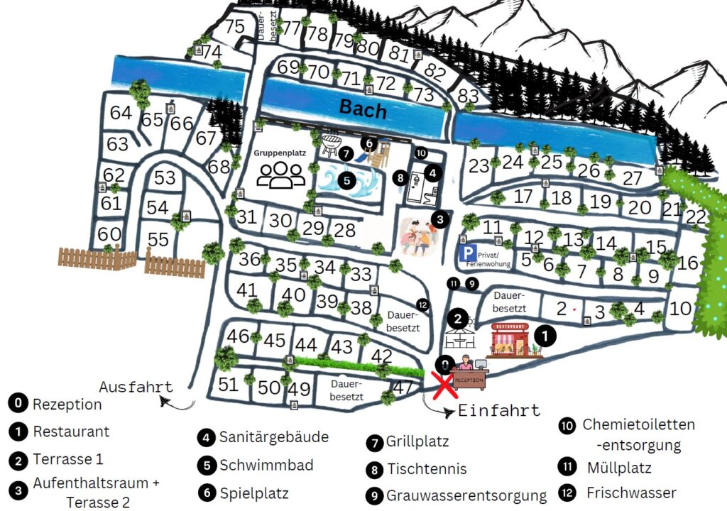 To help you find your way around quickly, we have clearly marked all the important areas of the campsite for you. From the reception and restaurant to the playground, sanitary facilities, and pitches—our site map shows you where everything is located. So you can start your vacation feeling relaxed!